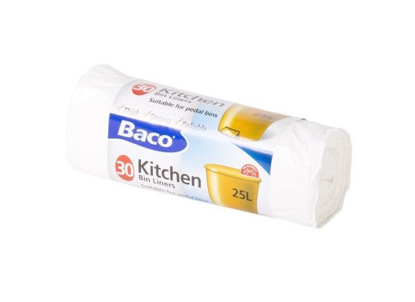 Content | Baco 25L White Pedal Bin Liners Roll of 30 : Strong, thick and reliable bin liners that give you the reassurance you need. These liners have been specifically designed and created for 25L kitchen pedal bins. Easy tie handles. Size: 53cm x 75cm. |